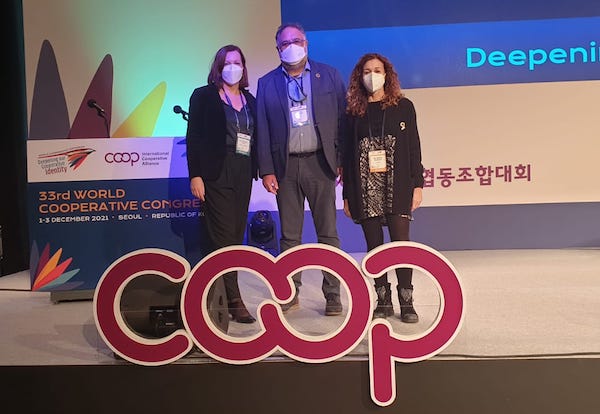 El 33 Congreso Cooperativo Mundial organizado por la Alianza Cooperativa Internacional en Seúl ha concluido algo antes de lo previsto por la aplicación del protocolo COVID. A pesar de todo, la experiencia para COCETA ha sido fructífera, con participación activa en las ponencias, stand propio compartido con las organizaciones cooperativas de Euskadi, y la firma de un acuerdo importante para nuestras empresas. Nuestros vicepresidentes, Malena Riudavets y Emilio Sampedro, han representado a más de 17.300 cooperativas de trabajo en la capital de Corea del Sur, dejando clara la fortaleza española del cooperativismo y aprendiendo de las experiencias de otros países importables al nuestro.